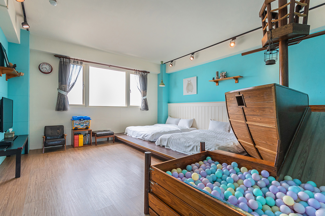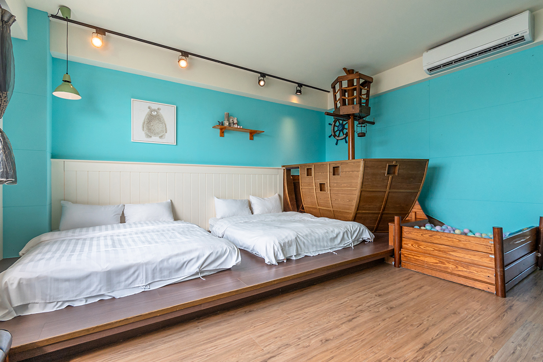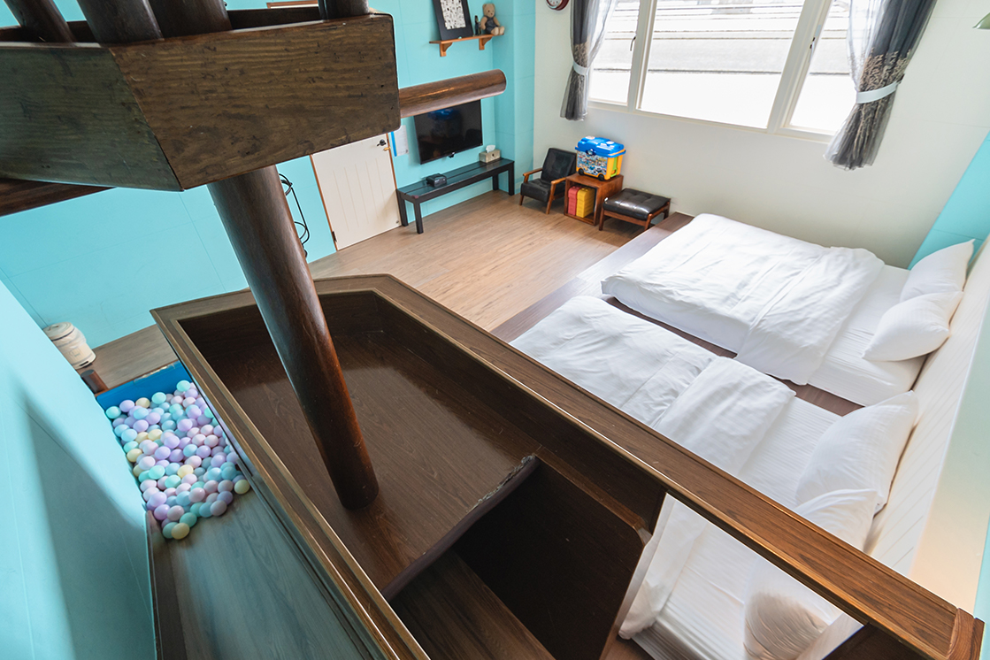 浮光民宿分成四人房及五人房,每間房均有溜滑梯及球池,可容納8~25人包棟住宿。針對嬰幼兒,民宿也提供兒童澡盆、嬰兒床,幫爸比媽咪減輕行李負擔。